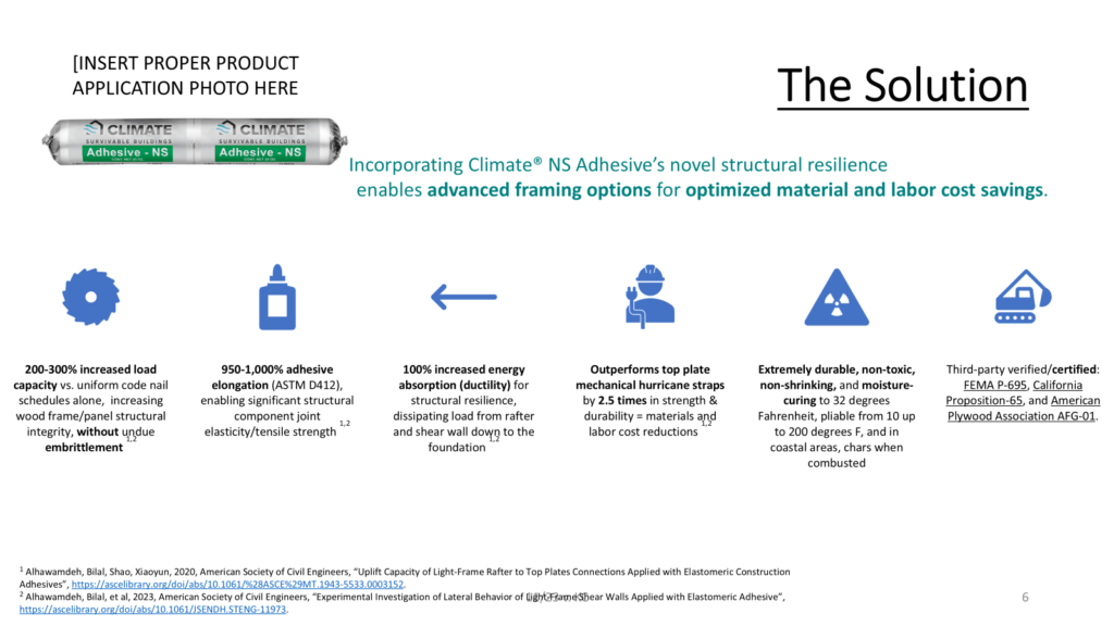 Want to be the hero to your clients AND your accountant? Insist on building to weather reality with a structure 2-3 times as resilient to violent wind and seismic events than with mandated mechanical fasteners alone, for pennies on the dollar. Our high-performance construction adhesive not only enables proven hardening, it also allows for advanced framing options to lock in additional material and labor cost-savings. A hardened structure for less? It’s Climate®-Adhesive Possible.”